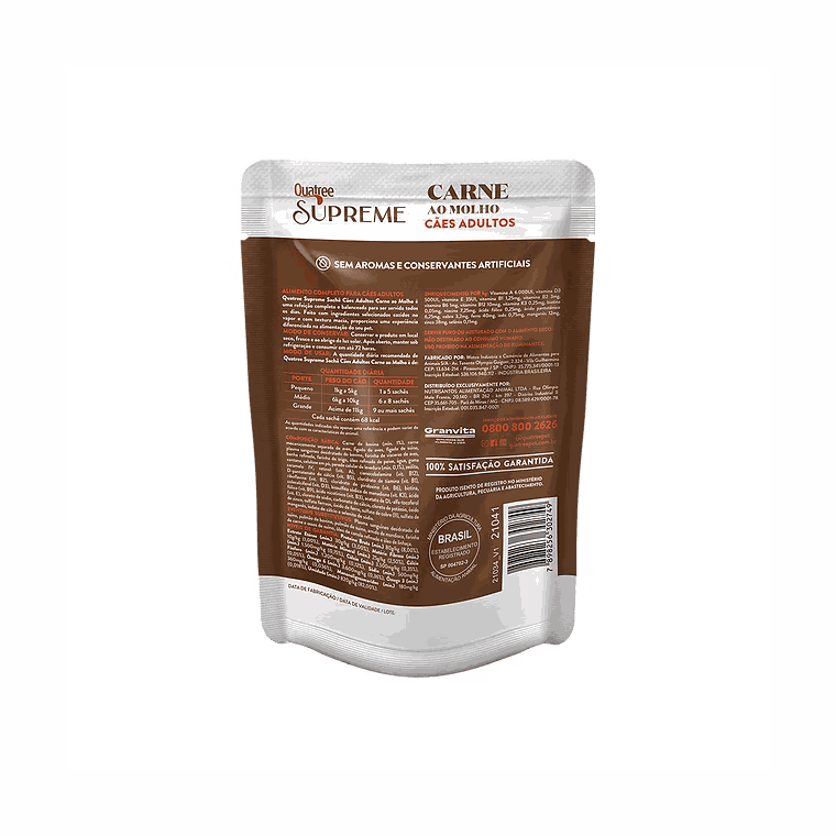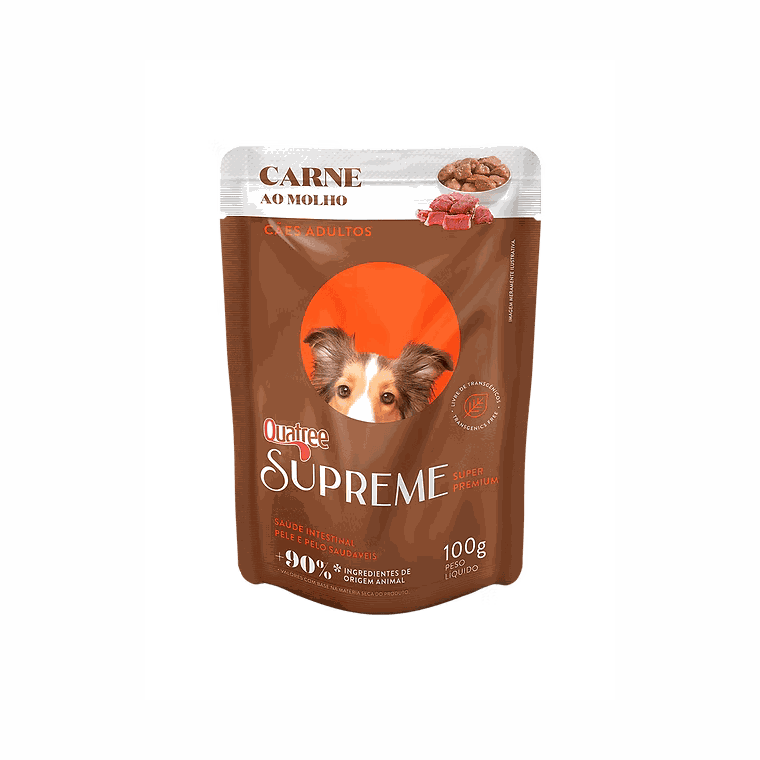 Quatree Supreme Sachê Cães Adultos Carne ao Molho é uma refeição completa e balanceada para ser servida todos os dias.